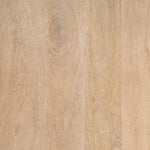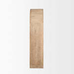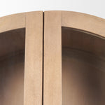 The Suri Curio Cabinet is constructed from solid light brown wood with two clear, smooth glass cabinet doors and solid handmade brass handles.