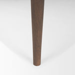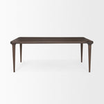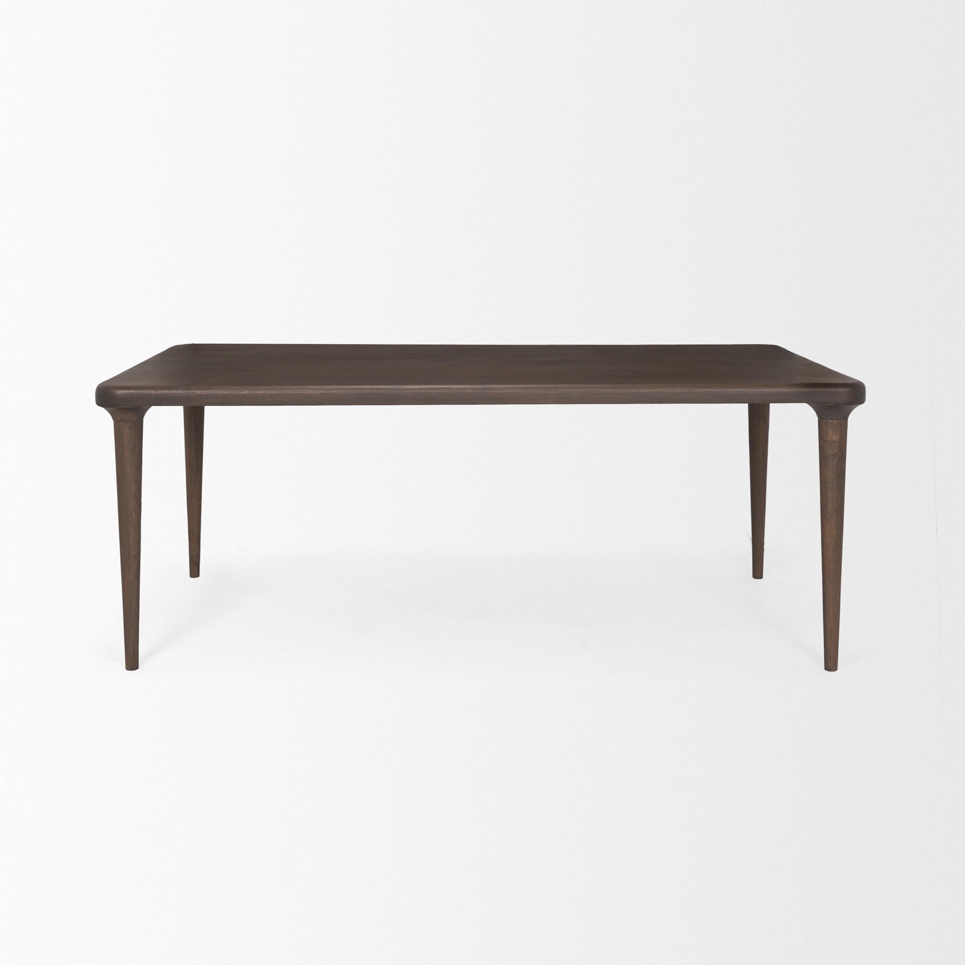 Suvan Dining Table is a smooth, medium-dark solid mango wood rectangular table with slim tapered legs and rounded edges.