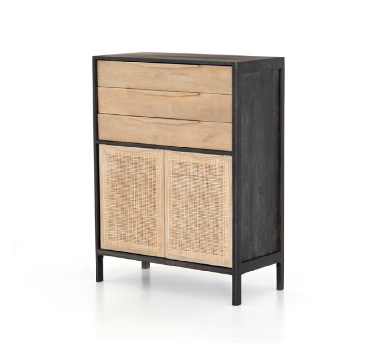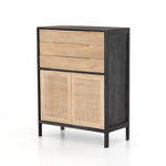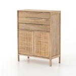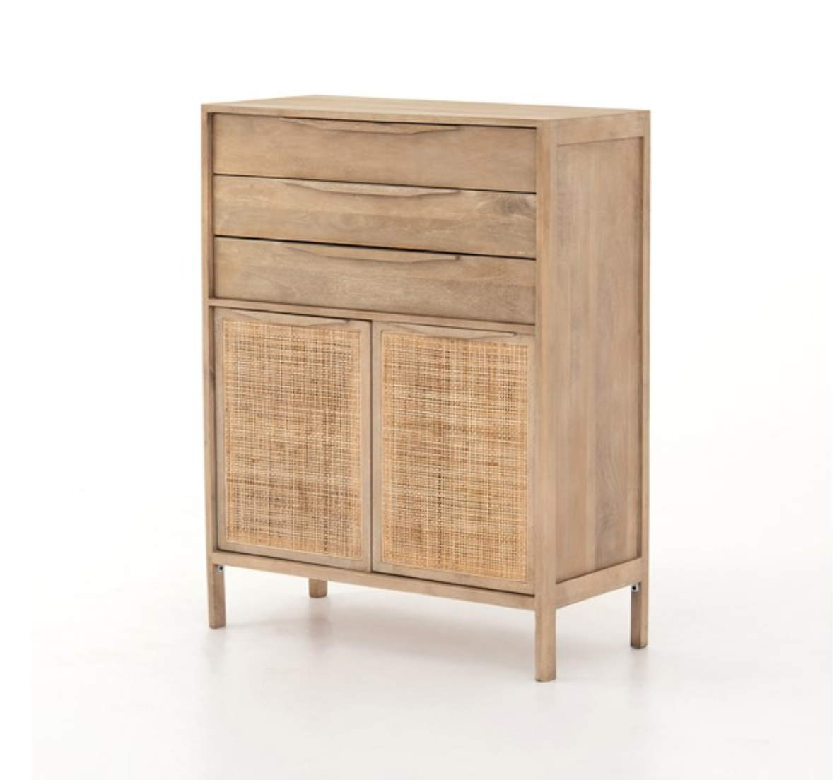 Natural mango framing features front cabinetry of woven cane, for a light, textural look with fresh organic allure. A top trio of drawers brings plenty of storage space to the bedroom.