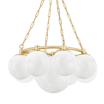 Make a statement on the ceiling with this gorgeous chandelier. Cloud glass globes are arrayed around a larger glass globe at the center creating a silhouette that is stunning whether viewed from across the room or directly underneath. The cloud glass has a wispy, natural feel and the Aged Brass framework and chain detailing add more warmth to this light and airy showstopper.