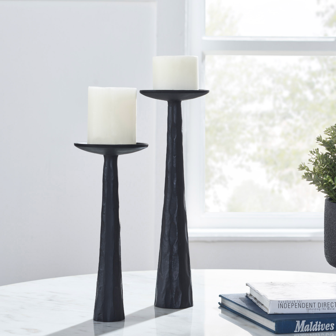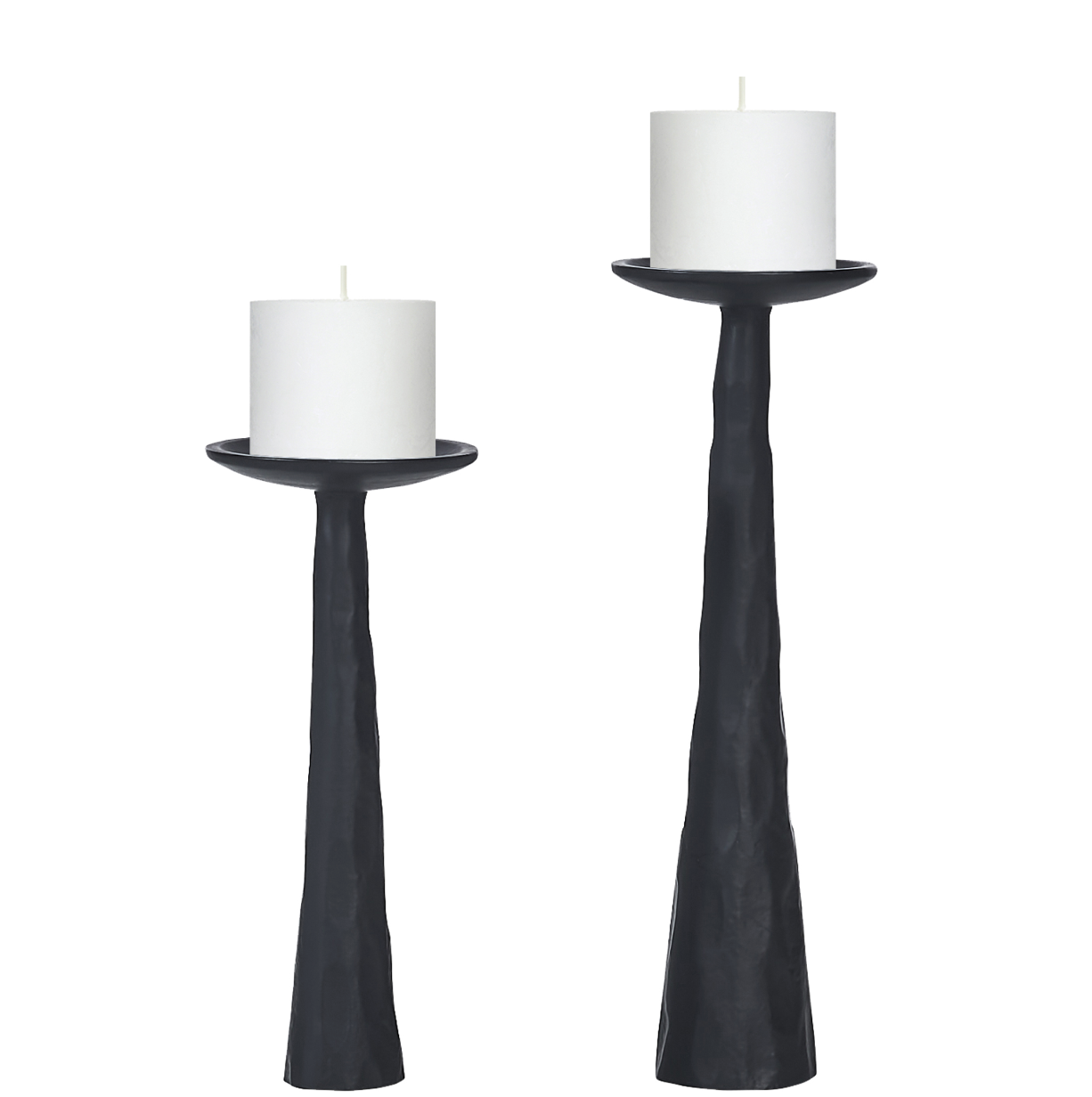 Gothic glamor envelops the stylish interior living space when these candle holders enter the space. With one pillar standing at 13 inches and the other 10, they complement one another and create greater dramatic impact through their differences. Composed of cast aluminum painted matte black, they are even more exquisite with glowing candles atop.