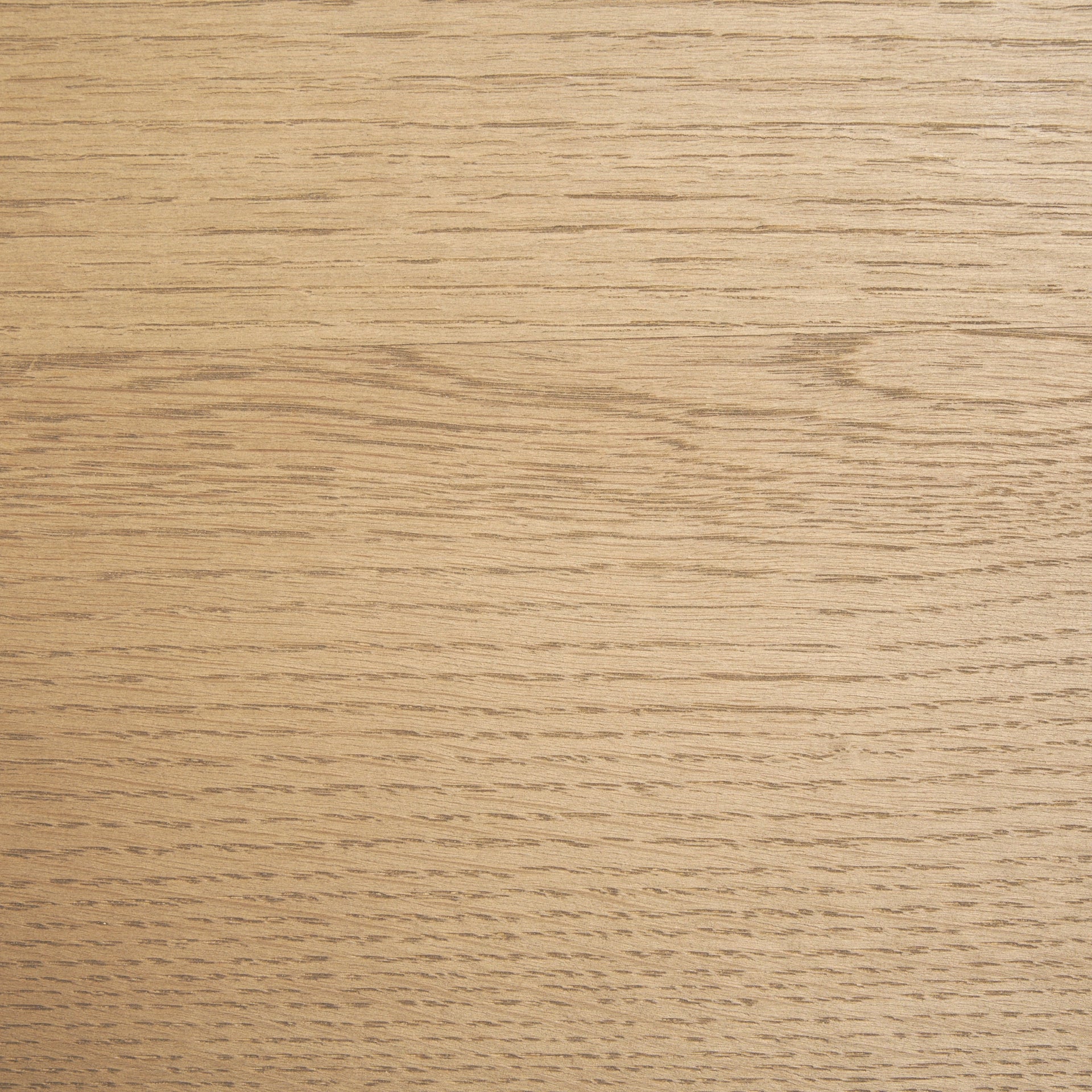 The Tino Desk is constructed from light brown solid oak wood with one concealed drawer and 3 side drawers with sleek matte black metal pulls.