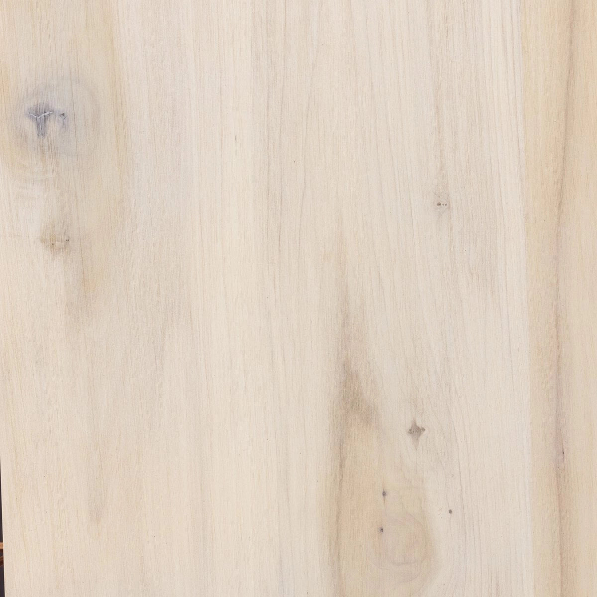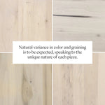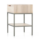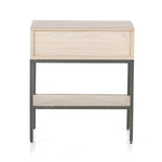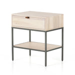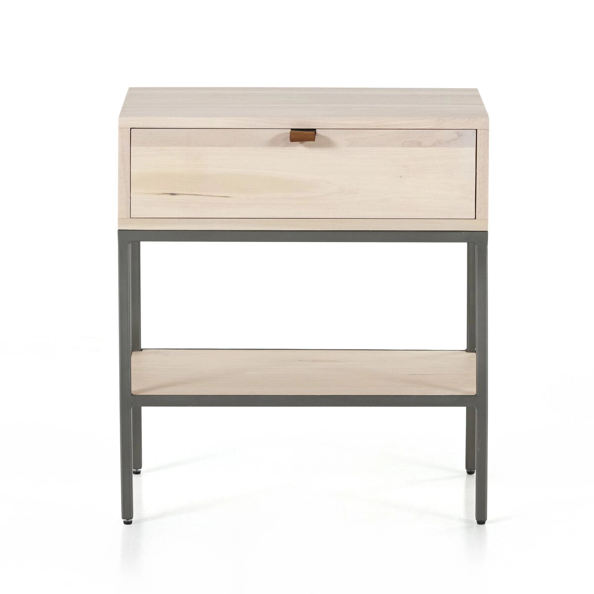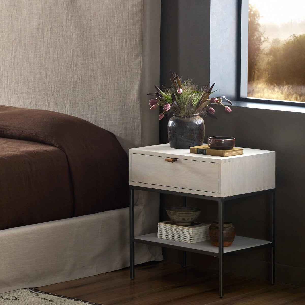 Inspired by clean midcentury design, a stylish nightstand of light-washed solid poplar brings extra storage space to the bedside. A metal-secured top-grain leather pull adds a textural element of surprise.