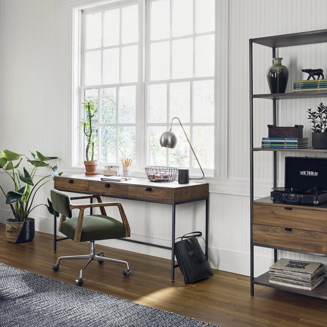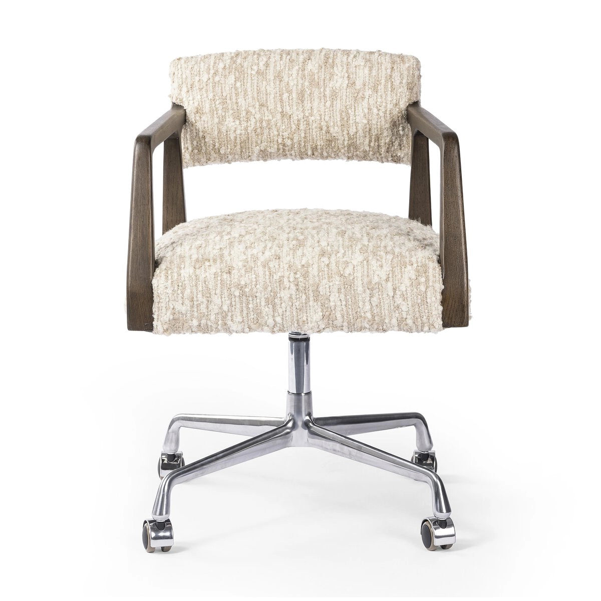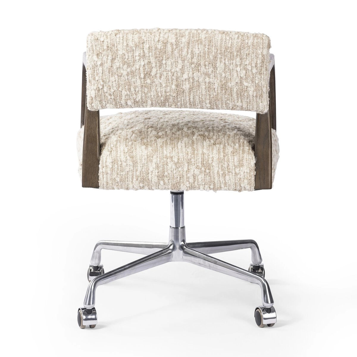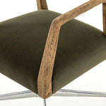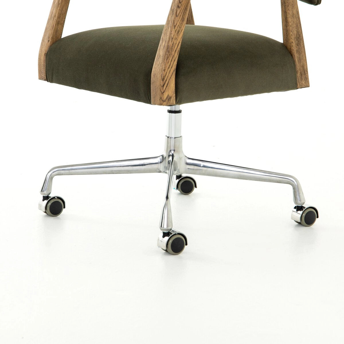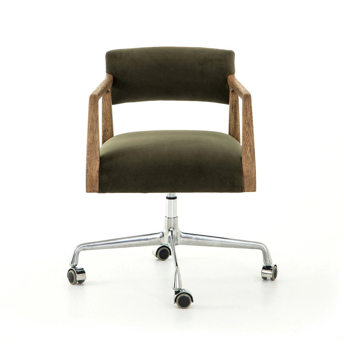 An angular, distressed oak frame holds a deep seat and striking, low-slung back. Covered in an olive seating fabric. Metal casters make for ease in the workplace. Height not adjustable.