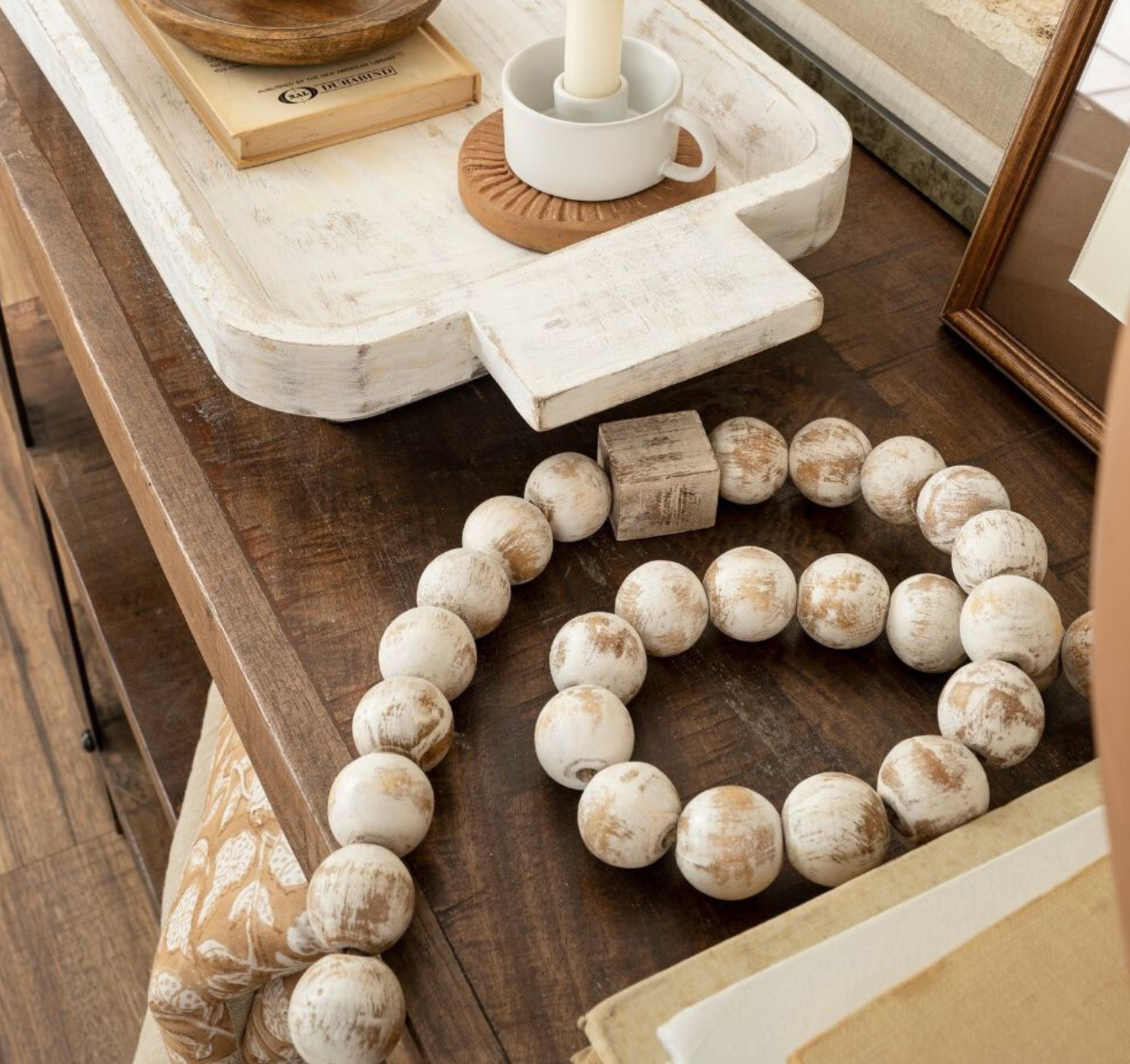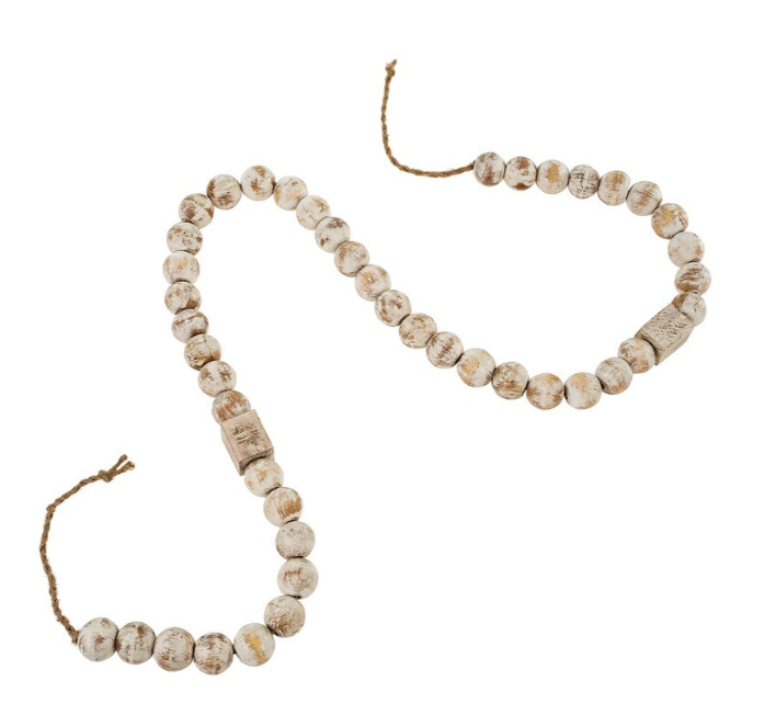 The Wooden Bead Garland features oversized round and cuboid whitewashed mango wood beads strung on jute chord. Adding a feel-good style accent, it shines when draped over a stack of favourite books, woven between decor pieces on a side console or to add a touch of textural warmth wherever it's needed.